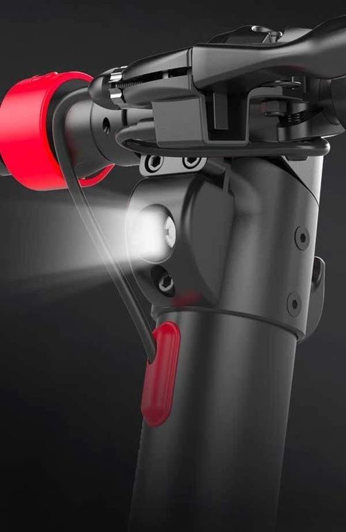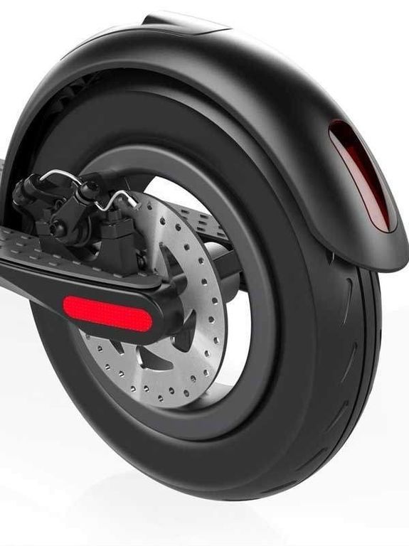 - Самокат оснащен двойными дисковыми тормозами. Эта система похожа на велосипедную, но главное ее отличие — антиблокировка E-ABS, которая установлена для более быстрого и безопасного торможения.