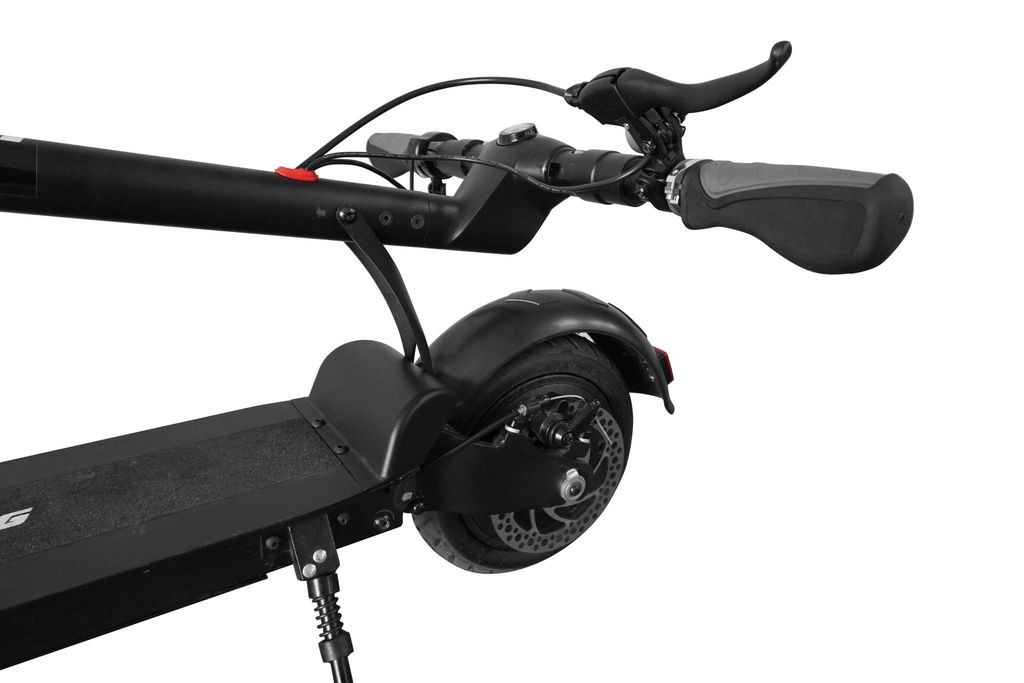 Передняя фара самоката яркая и имеет настройку угла свечения. Сзади на крыле установлен габарит, который загорается красным при включении подсветки. При торможении габарит становится ярче.