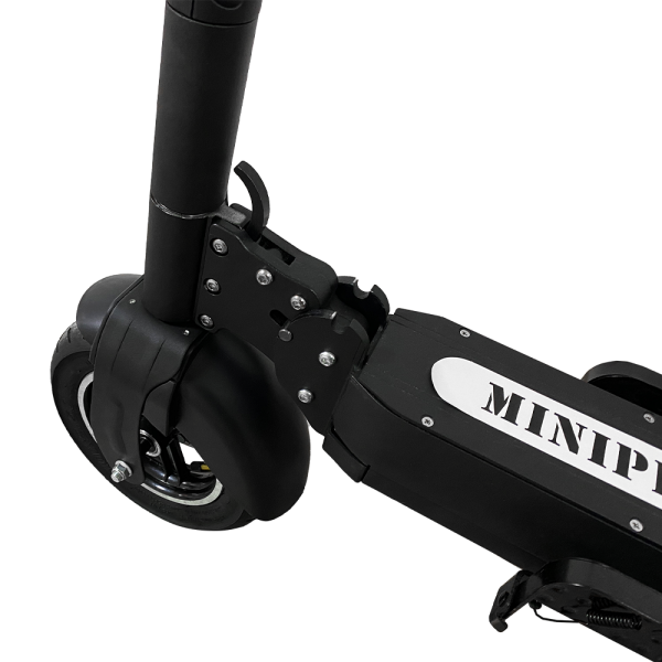 - Вся конструкция MiniPro сделана из металла. Даже складной механизм и тормозные ручки. Это плюс к сроку службы электросамоката, поскольку вероятность, что появится люфт в рулевой колонке — минимальный.