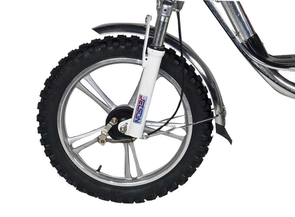 - Спереди установлена вилка, которая сглаживает неровности и позволяет наслаждаться комфортной плавной ездой. А также продлевает срок службы электровелосипеда, снижая воздействия от вибрации и ударов.