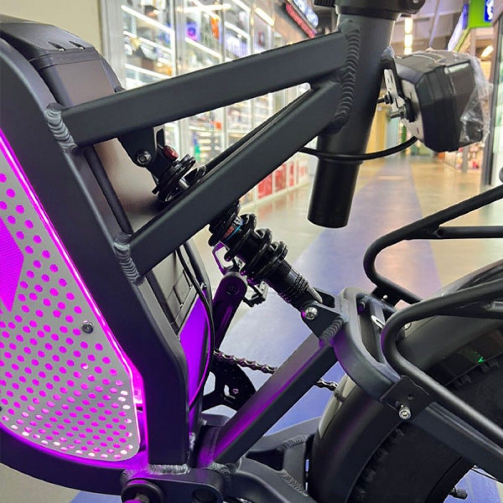 Электровелосипед оснащен 20-дюймовыми колесами, которые обеспечивают устойчивость и хорошее сцепление с дорогой. Цельная алюминиевая рама делает конструкцию прочной и легкой, а двухподвесная система амортизации смягчает удары при движении по неровным поверхностям. Это позволяет уверенно передвигаться как по городу, так и по пересеченной местности.